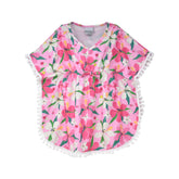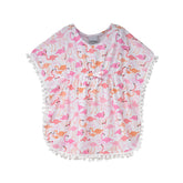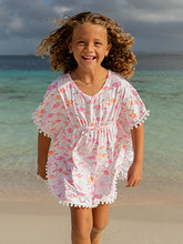 UPF 50+ Kaia Beach Swim Cover-Up: Your little girl will be comfy and cute on your next family beach trip or poolside outing with our UPF 50+ triple brushed cover-up dress. This super cute cover-up features our colorful prints with rows of white pom poms down both sides for a unique and adorable look your little one will love. Featuring a v-neck and relaxed-fit short sleeves, This toddler girls’ cover-up is made from 92% brushed polyester 8% Spandex for softness and comfort against her skin. Perfect for mixing and matching with her swimwear for lots of sweet summer looks, This cover-up dress is sure to become a favorite for all sunny days.