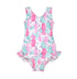 UPF 50+ Delaney Hip Ruffle Swimsuit-D: Your little one will look cute as a button in this popular Flap Happy swimsuit made from recycled plastic bottles! It features vibrant, fade-resistant quick-dry prints. Adorable ruffles around the leg openings and chemical-free UPF 50+ protection coordinate with Flap Happy UPF 50+ hats which come in a variety of coordinating solid colors and prints for maximum sun protection and cuteness with three decades of experience protecting kids from the sun, you can have the utmost confidence in your Flap Happy products.